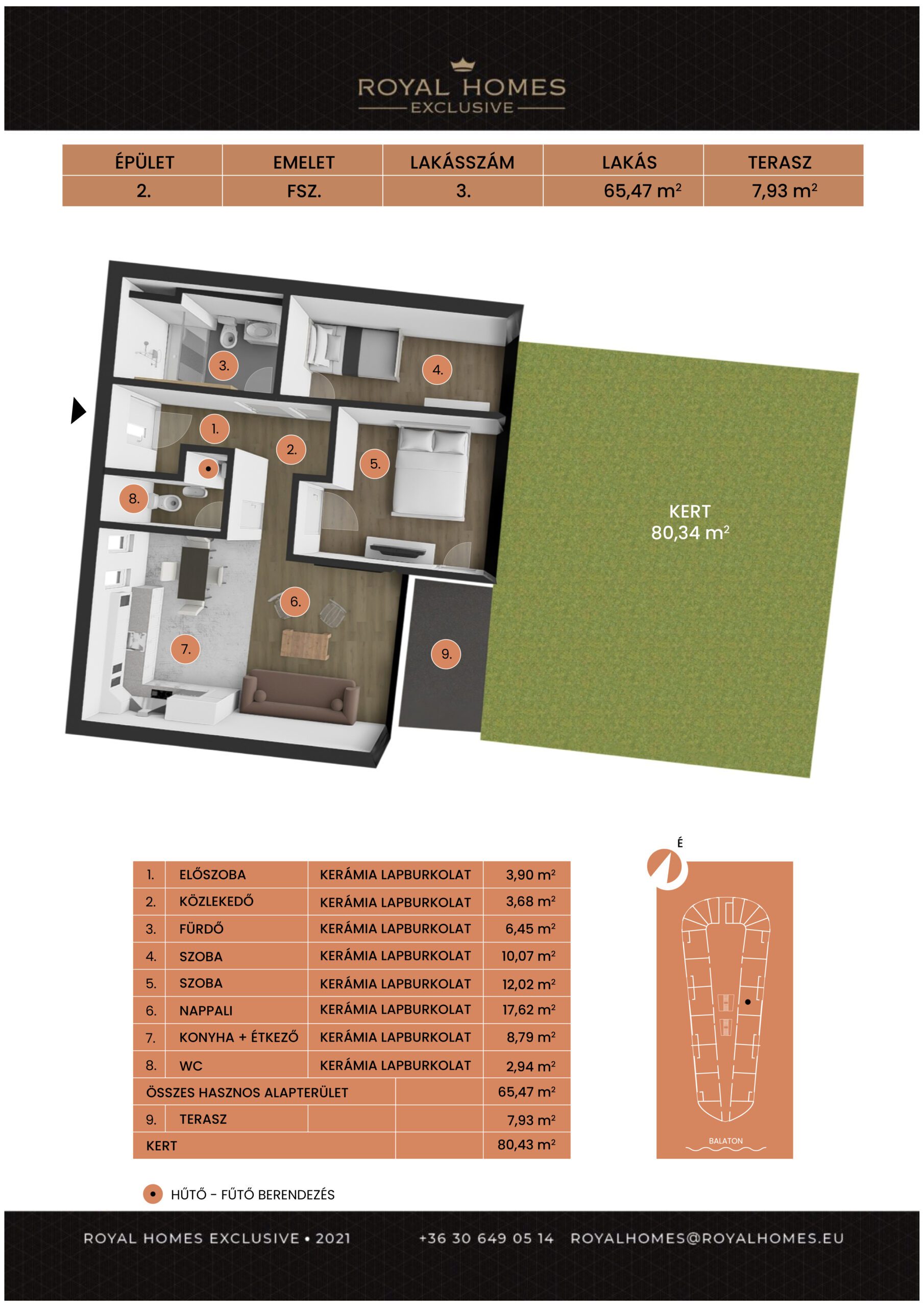 | lakásI/31 | EmeletI. | Szoba2+1 | Alapterület65,61 m2 | Terasz7,04 m2 | Akciós ár129 900 000 Ft | |||
